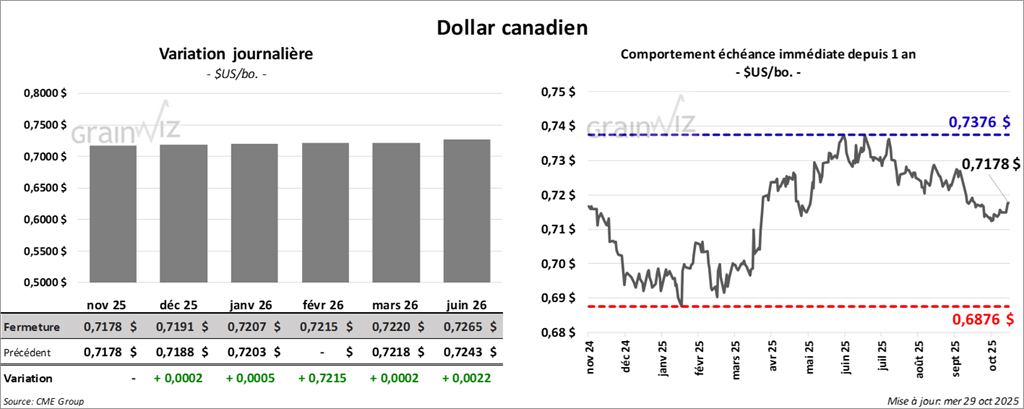 - Bloomberg rapporte que pour la première fois depuis des semaines, les Chinois auraient acheté au moins 2 cargaisons de soya américain, comme quoi les négociations entre la Chine et les États-Unis semblent débloquer sur certains points. Pour sa part, Reuters précise que l'organisme gouvernemental chinois, COFCO, aurait commandé 180,000 tonnes de soya américain pour des livraisons en décembre prochain. Toutefois, il reste que tout ceci demeure des rumeurs à confirmer, d'autant plus que les bureaux de l’USDA spécialisés dans les ventes à l'exportation sont toujours fermés en raison du « shutdown » fédéral. Une rencontre entre les présidents Trump et Xi est prévue ce soir et les analystes restent confiants.