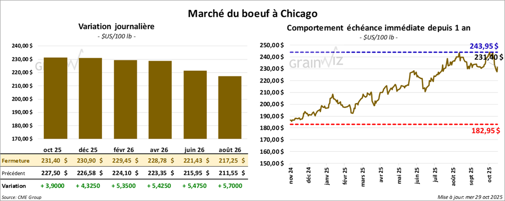 Le contrat de bœuf américain octobre 25 a clôturé à 231,40 $ (+ 3,90 $). Celui décembre 25 a fermé à 230,90 $ (+ 4,33 $). Celui février 26 a terminé à 229,45 $ (+ 5,35 $).