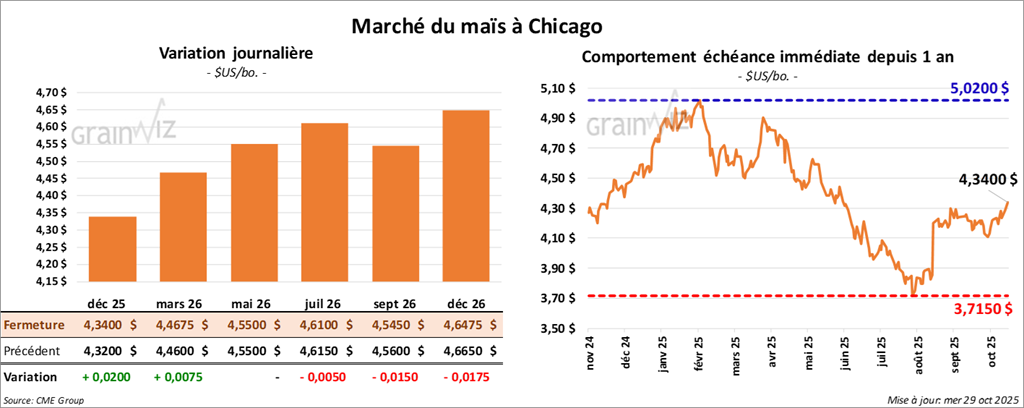 Le contrat de maïs américain décembre 25 a clôturé à 4,3400 $ (+ 2 cents). Celui mars 26 a fermé à 4,4675 $ (+ ¾ cent). Celui mai 26 a terminé à 4,5500 $ (0,0).
