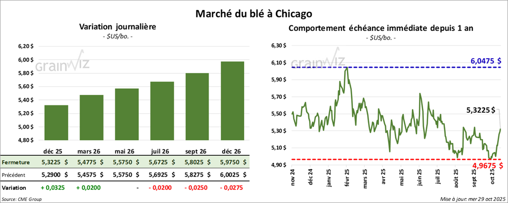 À Chicago, le contrat de blé décembre 25 a clôturé à 5,3225 $ (+ 3 ¼ cents). Celui mars 26 a fermé à 5,4775 $ (+ 2 cents). Celui mai 26 a terminé à 5,5750 $ (0,0).