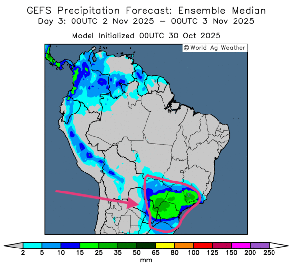 - Globalement, les prévisions météo pour le Brésil restent correctes, à court terme du moins. L'analyse des cartes du Brésil GFS (World Ag Weather) illustrées jusqu'au 3e jour révèle des possibilités de pluie plus ou moins abondantes dans l'est, à la hauteur du Minas Gerais, jusqu'au sud, vers le Rio Grande do Sul. Ailleurs, dans le centre du Brésil, les conditions pourraient être plus sèches.