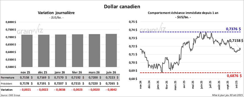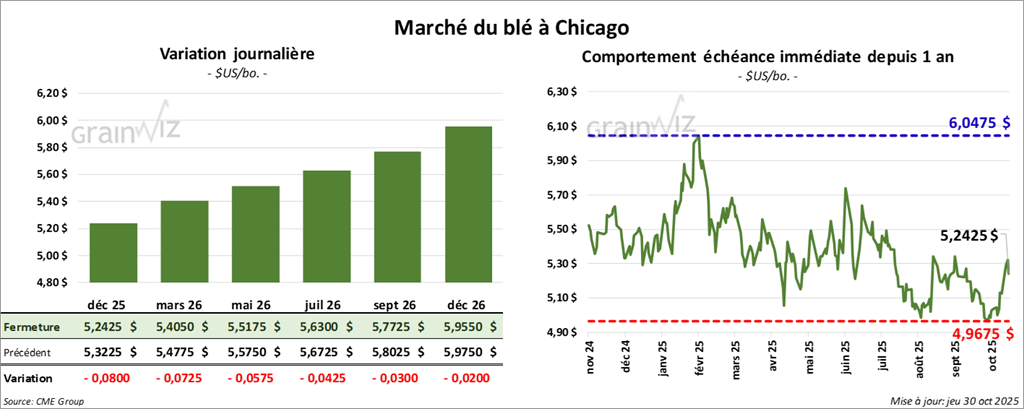 À Chicago, le contrat de blé décembre 25 a clôturé à 5,2425 $ (-8 cents). Celui mars 26 a fermé à 5,4050 $ (-7 ¼ cents). Celui mai 26 a terminé à 5,5175 $ (- 5 ¾ cents).
