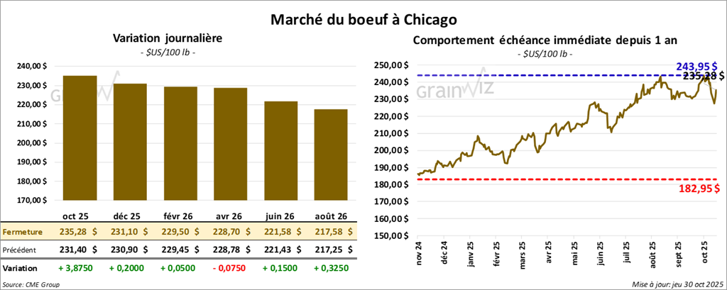 Le contrat de bœuf américain octobre 25 a clôturé à 235,28 $ (+ 3,88 $). Celui décembre 25 a fermé à 231,10 $ (+ 20 cents). Celui février 26 a terminé à 229,50 $ (+ 0,05 cent).
