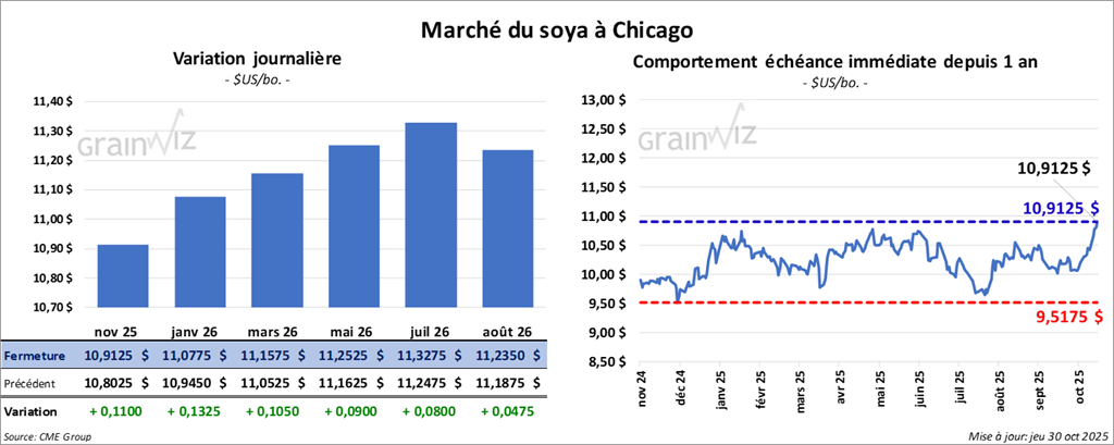 Le contrat de soya américain novembre 25 a clôturé à 10,9125 $ (+ 11 cents). Celui janvier 26 a fermé à 11,0775 $ (+ 13 ¼ cents). Celui mars 26 a terminé à 11,1575 $ (+ 10 ½ cents).