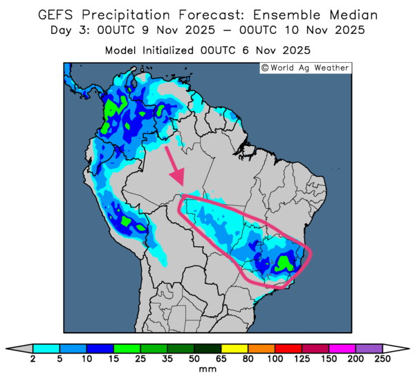 - Carte du 3e jour (ci-contre) : des précipitations favorables sont probables du centre-sud à la latitude du Mato Grosso et plus à l’est, jusqu’au Minas Gerais via le Goiás.