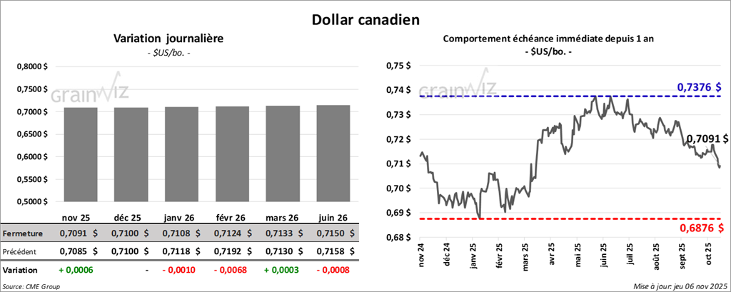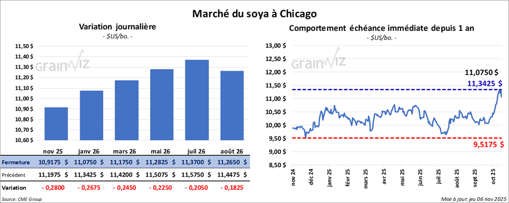 Le contrat de soya américain novembre 25 a clôturé à 10,9175 $ (- 28 cents). Celui janvier 26 a fermé à 11,0750 $ (- 26 ¾ cents). Celui mars 26 a terminé à 11,1750 $ (- 24 ¾ cents).