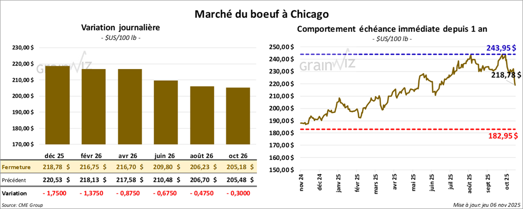 Le contrat de bœuf américain décembre 25 a clôturé à 218,78 $ (- 1,75 $). Celui février 26 a fermé à 216,75 $ (-1,38 $). Celui avril 26 a terminé à 216,70 $ (- 88 cents).