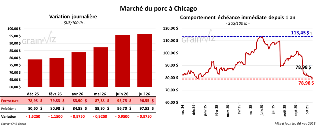 Le contrat de porc américain décembre 25 a clôturé à 78,97 $ (-1,63 $). Celui février 26 a fermé à 79,83 $ (-1,15 $). Celui avril 26 a terminé à 83,90 $ (-97 cents).