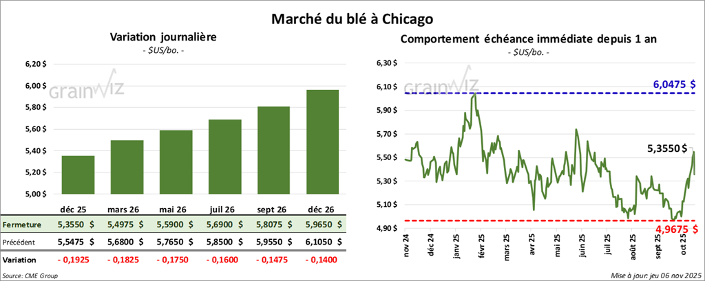 À Chicago, le contrat de blé décembre 25 a clôturé à 5,3550 $ (-19 ¼ cents). Celui mars 26 a fermé à 5,4975 $ (- 18 ¼ cents). Celui mai 26 a terminé à 5,5900 $ (-17 ½ cents).