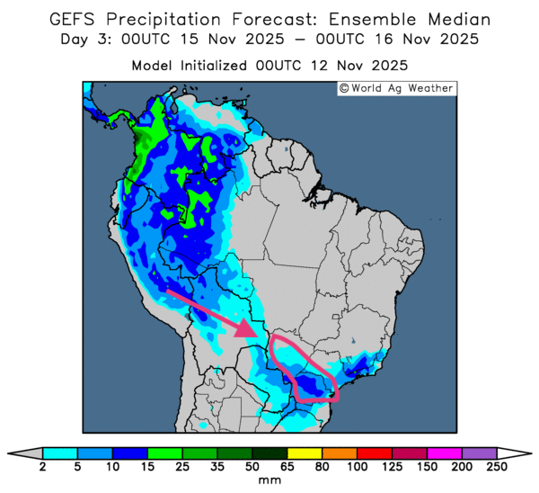 - Globalement, les prévisions météo pour le Brésil sont correctes à court terme. L'analyse des cartes GFS du Brésil, fournies par World Ag Weather et illustrées jusqu'au 3e jour, révèle surtout des possibilités de pluies concentrées dans le sud et le sud-est, à la hauteur du Mato Grosso do Sul et plus à l'est, au Paraná.