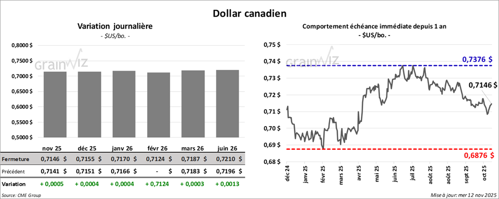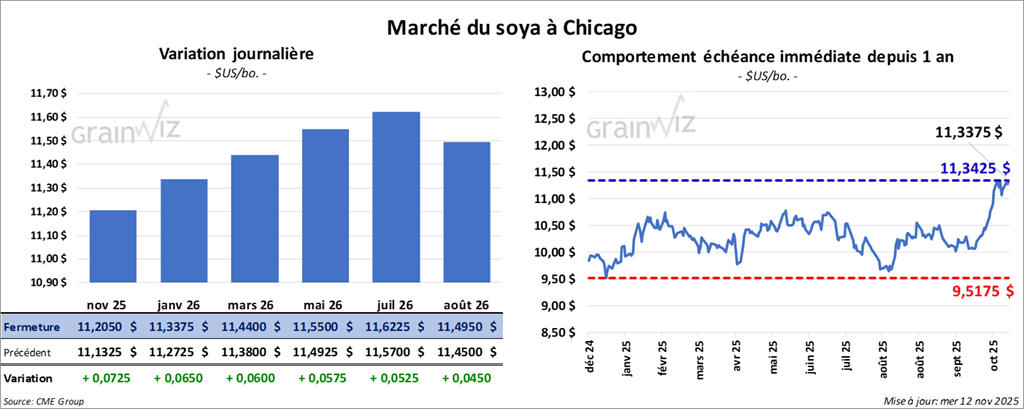 Le contrat de soya américain novembre 25 a clôturé à 11,2050 $ (+ 7 ¼ cents). Celui janvier 26 a fermé à 11,3375 $ (+ 6 ½ cents). Celui mars 26 a terminé à 11,4400 $ (+ 6 cents).