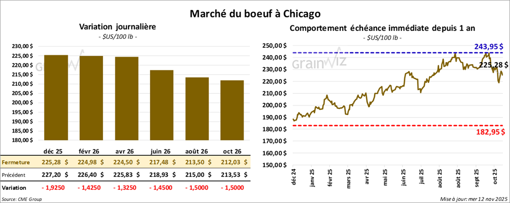 Le contrat de bœuf américain décembre 25 a clôturé à 225,28 $ (-1,93 $). Celui février 26 a fermé à 224,98 $ (-1,43 $). Celui avril 26 a terminé à 224,50 $ (-1,33 $).