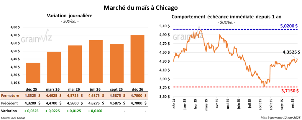 Le contrat de maïs américain décembre 25 a clôturé à 4,3525 $ (+ 3 ¼ cents). Celui mars 26 a fermé à 4,4925 $ (+ 2 ¼ cents). Celui mai 26 a terminé à 4,5725 $ (+ 1 ¼ cent).
