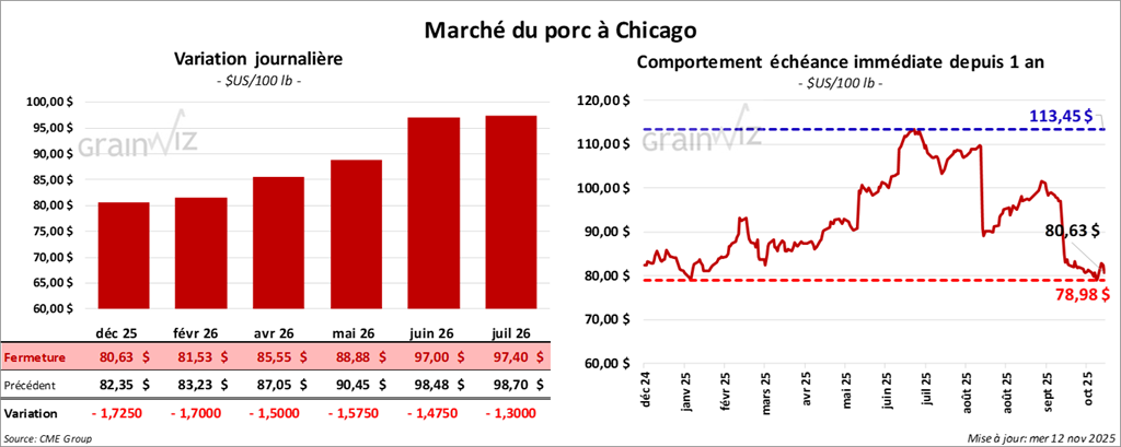 Le contrat de porc américain décembre 25 a clôturé à 80,63 $ (-1,73 $). Celui février 26 a fermé à 81,53 $ (-1,70 $). Celui avril 26 a terminé à 85,55 $ (-1,50 $).