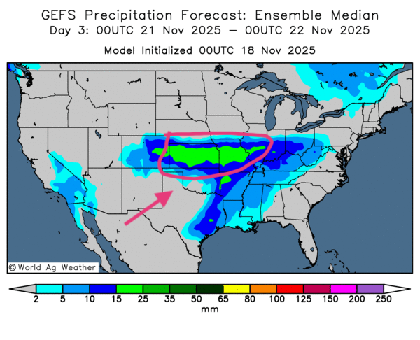 - La pluie attendue au cours des prochains jours dans le sud des Grands Lacs et certaines parties des Grandes Plaines ne devrait pas nuire au blé d’hiver nouvellement semé. Cette perspective a agi comme une résistance à la hausse des cours.