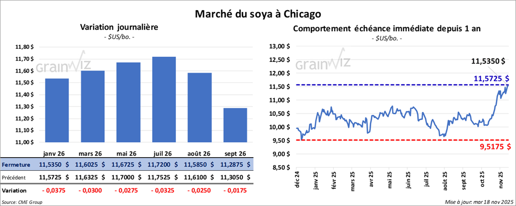 Le contrat de soya américain janvier 26 a clôturé à 11,5350 $ (- 3 ¾ cents). Celui mars 26 a fermé à 11,6025 $ (- 3 cents). Celui mai 26 a terminé à 11,6725 $ (- 2 ¾ cents).