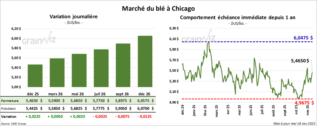À Chicago, le contrat de blé décembre 25 a clôturé à 5,4650 $ (+ 2 ¼ cents). Celui mars 26 a fermé à 5,5900 $ (+ ½ cent). Celui mai 26 a terminé à 5,6850 $ (+ ¼ cent).