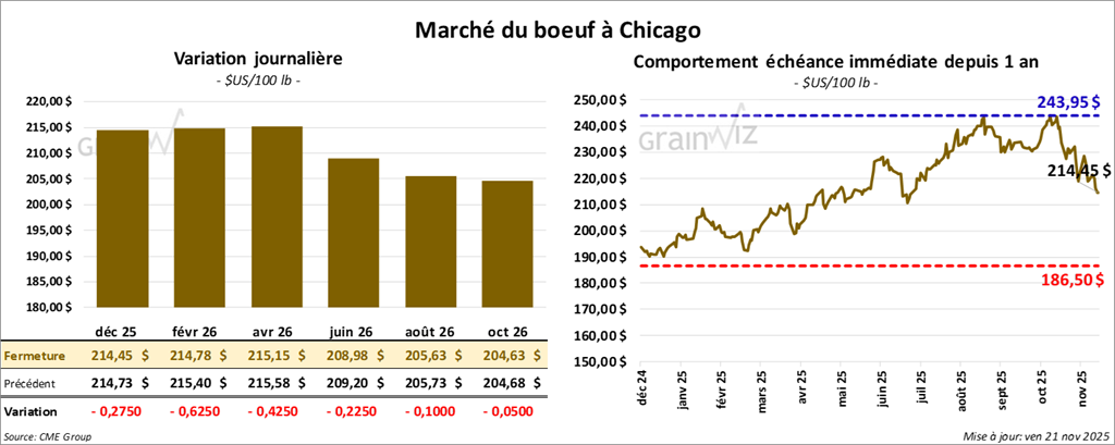 Le contrat de bœuf américain décembre 25 a clôturé à 214,45 $ (-28 cents). Celui février 26 a fermé à 214,78 $ (-63 cents). Celui avril 26 a terminé à 215,15 $ (-43 cents).