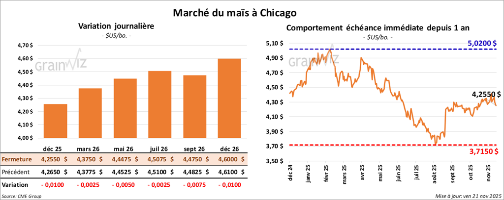 Le contrat de maïs américain décembre 25 a clôturé à 4,2550 $ (+ 1 cent). Celui mars 26 a fermé à 4,3750 $ (- ¼ cent). Celui mai 26 a terminé à 4,4475 $ (- ½ cent).