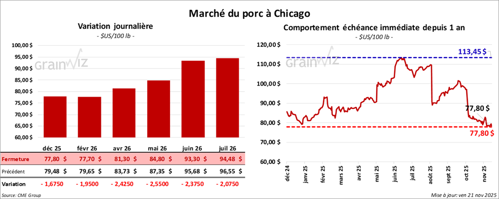 Le contrat de porc américain décembre 25 a clôturé à 77,80 $ (-1,68 $). Celui février 26 a fermé à 77,70 $ (-1,95 $). Celui avril 26 a terminé à 81,30 $ (-2,43 $).
