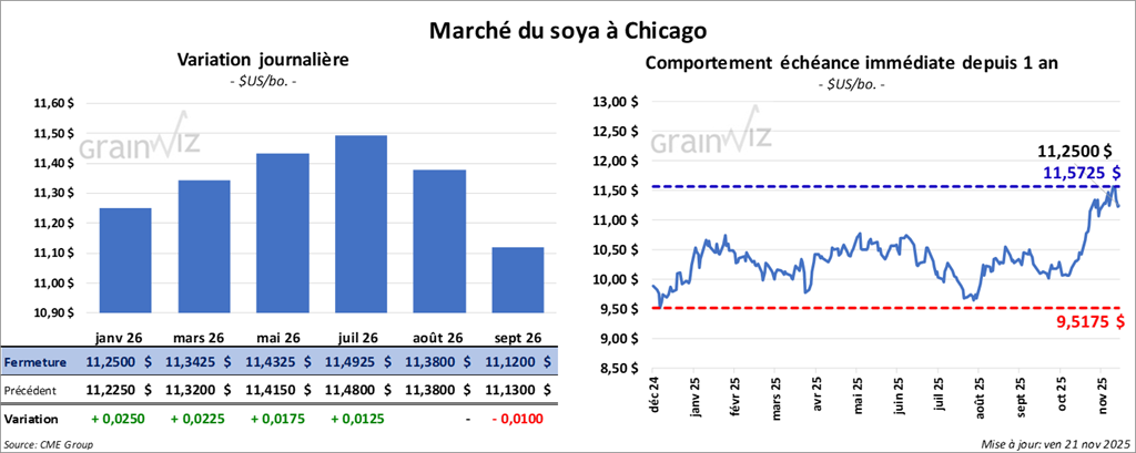 Le contrat de soya américain janvier 26 a clôturé à 11,2500 $ (+ 2 ½ cents). Celui mars 26 a fermé à 11,3425 $ (+ 2 ¼ cents). Celui mai 26 a terminé à 11,4325 $ (+ 2 ¼ cents).