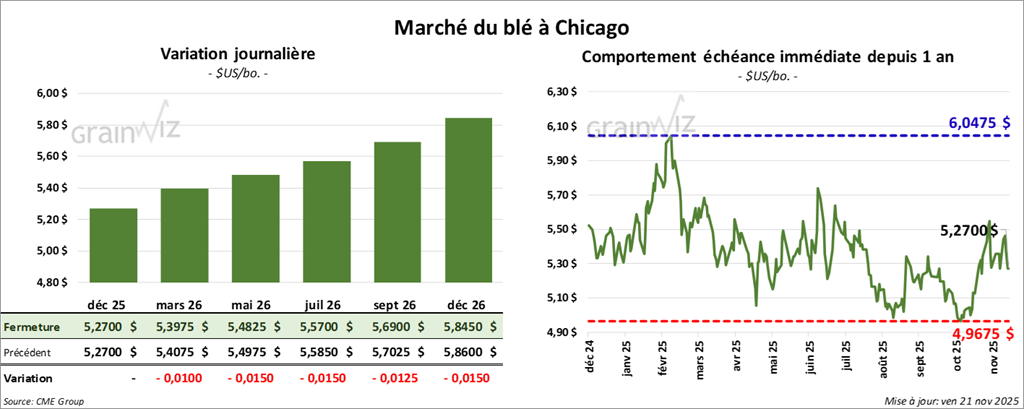 À Chicago, le contrat de blé décembre 25 a clôturé à 5,2700 $ (0,00). Celui mars 26 a fermé à 5,3975 $ (- 1 cent). Celui mai 26 a terminé à 5,4825 $ (- 1 ½ cent).