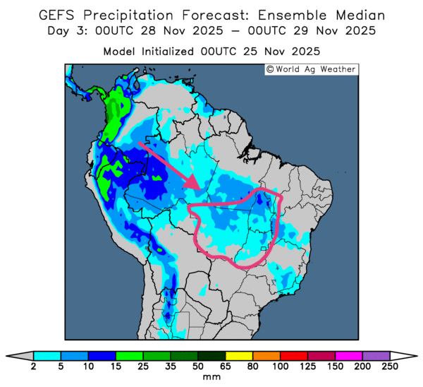 - Globalement, les prévisions météo pour le Brésil restent favorables à court terme. L'analyse des cartes GFS Brésil, fournies par World Ag Weather et dessinées jusqu'au 3e jour, met surtout en évidence des possibilités de pluie dans le centre-nord et certaines portions de l'est du pays. Ailleurs, notamment dans le sud, les conditions pourraient demeurer sèches. Il faudra suivre de près la formation du phénomène La Niña dans le Pacifique, qui pourrait entraîner un temps sec persistant dans le sud du Brésil ainsi que dans plusieurs secteurs de l'Argentine.