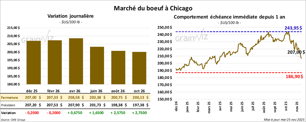 Le contrat de bœuf l'américain décembre 25 a cloturé à 207,00 $ (-20 cents). Celui février 26 a fermé à 207,33 $ (-20 cents). Celui avril 26 a terminé à 208,58 $ (+ 68 cents).