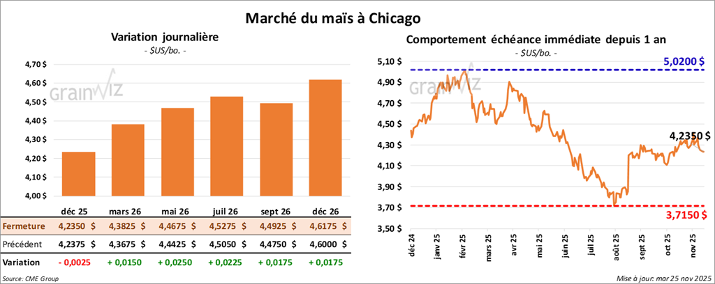 Le contrat de maïs décembre 25 a clôturé à 4,2350 $ (- ¼ cent). Celui mars 26 a fermé à 4,3825 $ (+ 1 ½ cent). Celui mai 26 a terminé à 4,4675 $ (+ 2 ½ cents).