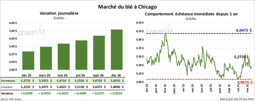À Chicago, le contrat de blé décembre 25 a clôturé à 5,2725 $ (+ 5 cents). Celui mars 26 a fermé à 5,3925 $ (+ 4 ½ cents). Celui mai 26 a terminé à 5,4750 $ (+ 4 ¼ cents).