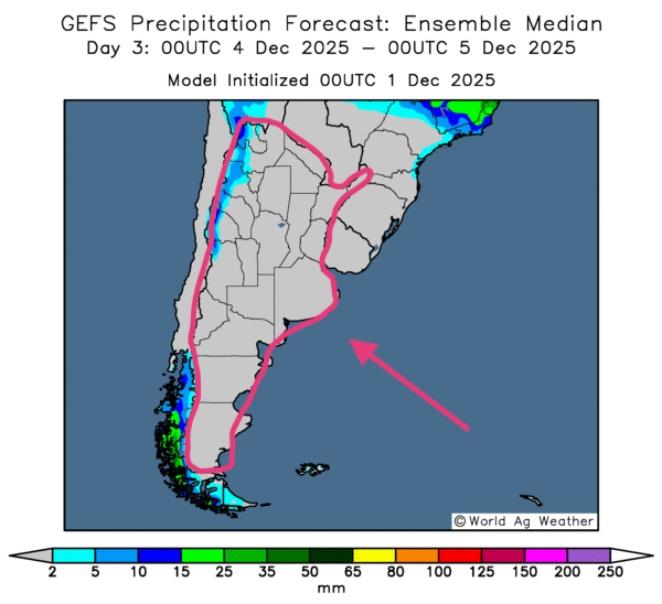 - En Argentine, les prévisions météo sont à surveiller à court terme. L’analyse des cartes GFS de l’Argentine produites par World Ag Weather et illustrées jusqu’au 3e jour indique qu’un temps sec pourrait persister sur une grande partie du territoire (voir la carte du 3e jour ci-contre).