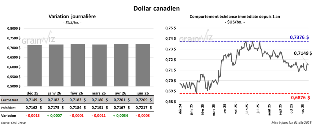Le contrat de maïs américain décembre 25 a clôturé à 4,3275 $ (- 2 ¾ cents). Celui mars 26 a fermé à 4,4500 $ (- 2 ¾ cents). Celui mai 26 a terminé à 4,5325 $ (-2 ½ cents).