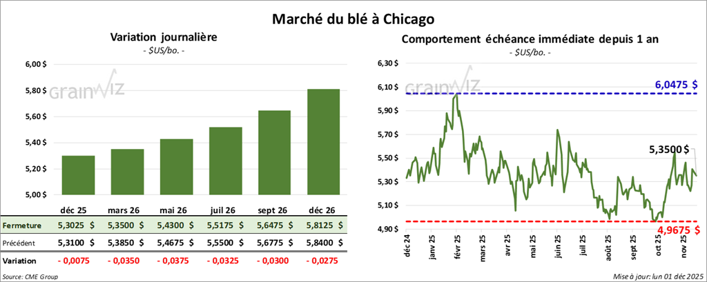 À Chicago, le contrat de blé décembre 25 a clôturé à 5,3025 $ (- ¾ cent). Celui mars 26 a fermé à 5,3500 $ (- 3 ½ cents). Celui mai 26 a terminé à 5,4300 $ (-3 ¾ cents).