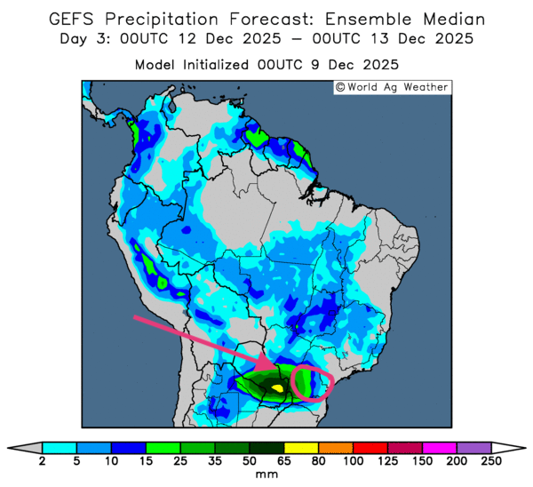 - Globalement, les prévisions météo pour le Brésil sont en constante amélioration, du moins à court terme. L'analyse des cartes GFS du Brésil, fournies par World Ag Weather et illustrées jusqu'au 3e jour, révèle des possibilités de pluies moins élevées pour la plupart des régions de production. Toutefois, des précipitations abondantes pourraient se profiler au 3e jour dans le sud-est, à la hauteur du Paraná (voir la carte du 3e jour ci-dessous).