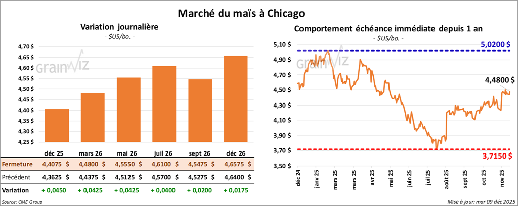 Le contrat de maïs américain décembre 25 a clôturé à 4,4075 $ (+ 4 ½ cents). Celui mars 26 a fermé à 4,4800 $ (+ 4 ¼ cents). Celui mai 26 a terminé à 4,5550 $ (+ 4 ¼ cents).