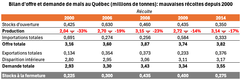 Bien que ce ne soit pas une surprise pour personne, le couperet est tombé. Non, cette année, la récolte de maïs n’a pas été au rendez-vous au Québec. À la fin août dernier, la Tournée des Grandes Cultures en était arrivée à une estimation de 3,11 MTM (fourchette de 2,9 à 3,3 MTM). Le 4 décembre dernier Statistique Canada a confirmé une lecture similaire avec une estimation à 2,9 MTM, en baisse de 18% par rapport à l’an dernier. Ce résultat est dans le bas de la prévision de la Tournée, ce qui s’explique en bonne partie par la baisse des superficies récoltées de -6,1%, ce qu’elle n’évalue pas. Lors d’année normale, on parle plutôt d’un écart de l’ordre de -0,5 à 1% entre les superficies semées et […] Lire la suite