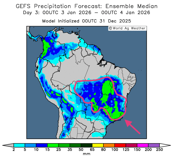 - Globalement, les prévisions météo pour le Brésil sont favorables à court terme. L'analyse des cartes du Brésil GFS, fournies par World Ag Weather et illustrées jusqu'au 3e jour, met surtout en évidence des pluies souvent bénéfiques sur l'ensemble des régions de production. Toutefois, ces averses pourraient devenir problématiques si elles se prolongent; l'humidité des sols pourrait alors être excessive par endroits.
