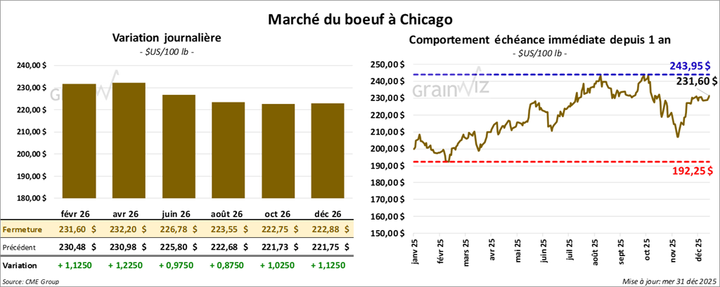 Le contrat de bœuf américain décembre 25 a clôturé à 232,00 $ (+83 cents). Celui février 26 a fermé à 231,60 $ (+1,13$). Celui avril 26 a terminé à 232,20 $ (+1,23 $).