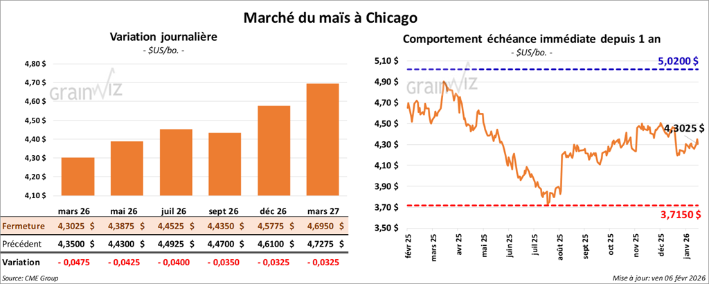 Le contrat de maïs américain mars 26 a clôturé à 4,3075 $ (- 4 ¼ cents). Celui mai 26 a fermé à 4,3925 $ (- 3 ¾ cents). Celui juillet 26 a terminé à 4,4600 $ (- 3 ¼ cents).