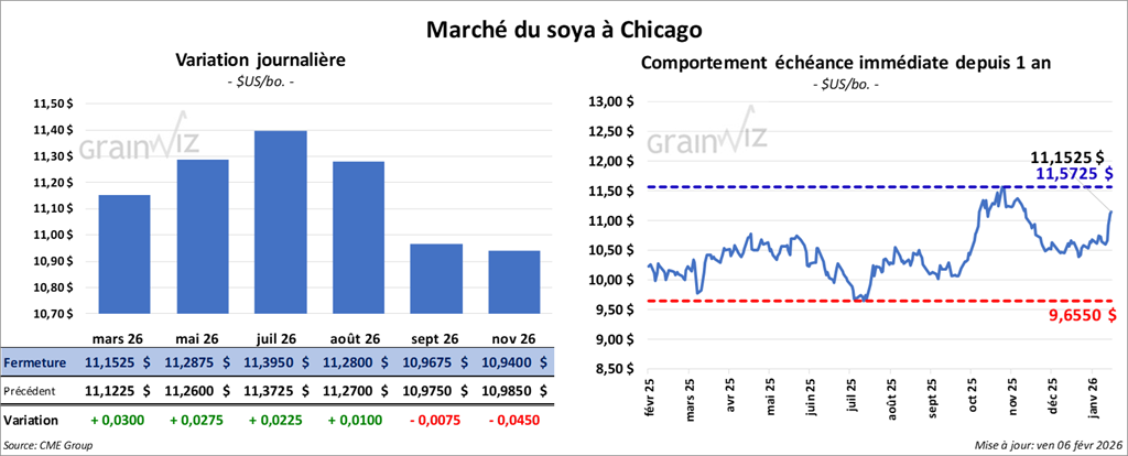 Le contrat de soya américain mars 26 a clôturé à 11,1475 $ (+ 2 ½ cents). Celui mai 26 a fermé à 11,2800 $ (+ 2 cents). Celui juillet 26 a terminé à 11,3900 $ (+ 1 ¾ cent).