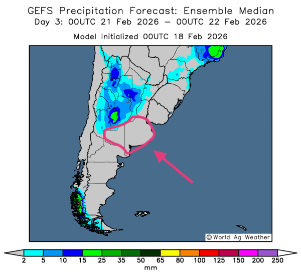 - Globalement, les conditions météorologiques semblent s’améliorer légèrement à court terme dans plusieurs régions de l’Argentine. L’analyse des cartes GFS (World Ag Weather), dessinées jusqu’au 3e jour, indique des probabilités d’averses bénéfiques pour plusieurs régions du nord, du centre et du sud du pays. Toutefois, certains secteurs de l’extrême nord et de l’est de l’Argentine pourraient connaître un temps toujours aussi sec. Les provinces comme celles de Buenos Aires et de La Pampa pourraient être particulièrement touchées (voir la carte du 3e jour ci-contre).