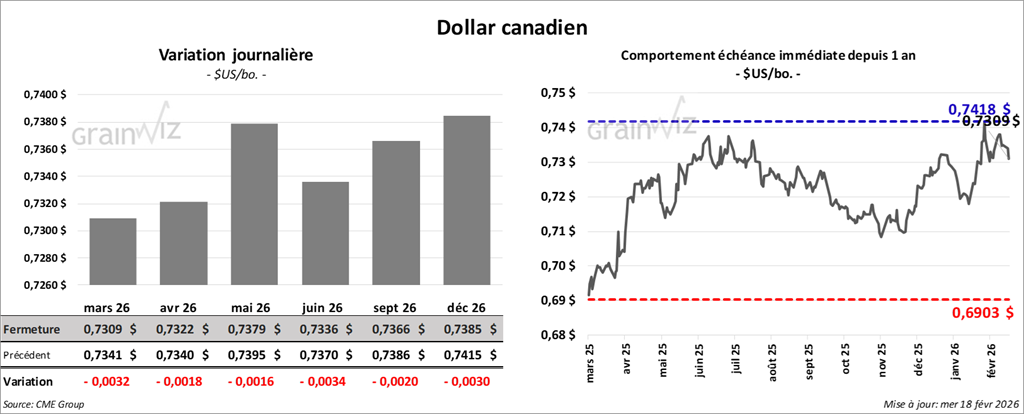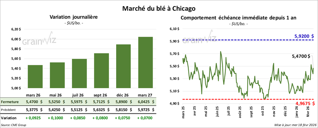 À Chicago, le contrat de blé mars 26 a clôturé à 5,4700 $ (+ 9 ¼ cents). Celui mai 26 a fermé à 5,5250 $ (+ 10 cents). Celui juillet 26 a terminé à 5,5975 $ (+ 8 ½ cents).