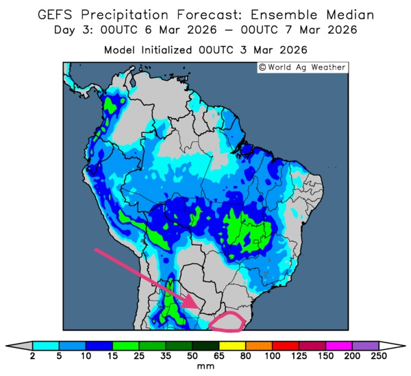 • Essentiellement, les prévisions météorologiques s’améliorent à court terme pour certaines parties de l’Argentine. L’analyse des cartes GFS (World Ag Weather) présentées jusqu’au 3e jour montre des possibilités de pluies bénéfiques pour le nord et certaines parties du centre du pays. Toutefois, un temps sec pourrait persister du centre jusqu’au sud de l’Argentine. Des provinces comme La Pampa et Buenos Aires, notamment, pourraient être affligées par des conditions sèches excessives, entraînant un stress hydrique constant pour différentes cultures (voir la carte du 3e jour ci-contre).