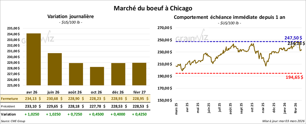 Le contrat de bœuf américain avril 26 a clôturé à 234,13 $ (+ 1,03 $). Celui juin 26 a fermé à 230,68 $ (+ 1,03 $). Celui août 26 a terminé à 228,90 $ (+ 73 cents).