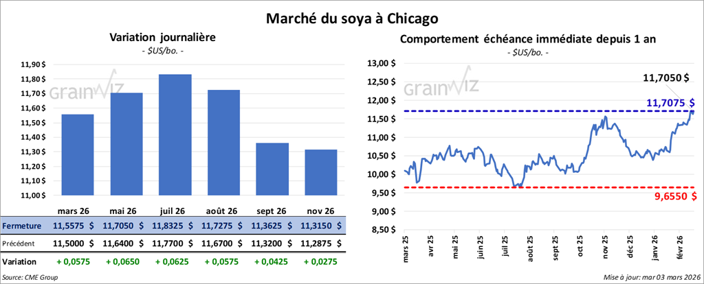 Le contrat de soya américain mars 26 a clôturé à 11,5575 $ (+ 5 ¾ cents). Celui mai 26 a fermé à 11,7050 $ (+ 6 ½ cents). Celui juillet 26 a terminé à 11,8325 $ (+ 6 ¼ cents).