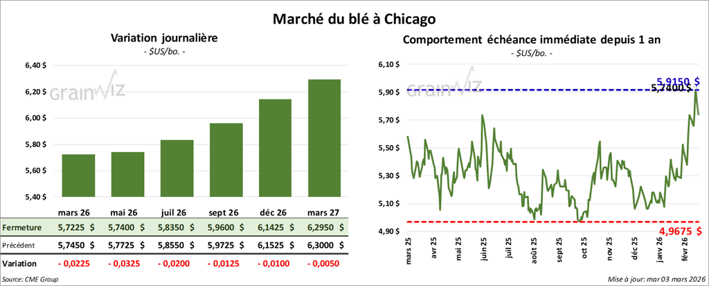 À Chicago, le contrat de blé mars 26 a clôturé à 5,7225 $ (- 2 ¼ cents). Celui mai 26 a fermé à 5,7400 $ (- 3 ¼ cents). Celui juillet 26 a terminé à 5,8350 $ (- 2 cents).