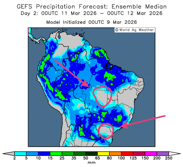 - Dans l’ensemble, les prévisions météorologiques pour le Brésil sont satisfaisantes à court terme. L’analyse des cartes GFS (World Ag Weather), illustrées jusqu’au 3e jour, montre des possibilités de pluie sur l’ensemble du pays. On note toutefois un temps potentiellement plus sec et favorable dans certaines portions du nord du Mato Grosso et, vers le sud-est, dans les environs du Paraná (voir la carte du 2e jour ci-contre). En revanche, les conditions se compliquent dans le reste du Brésil, où des pluies incessantes pourraient provoquer ou maintenir une humidité excessive des sols.