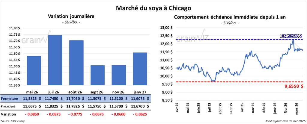 Le contrat américain du soya échéance mai 26 a clôturé à 11,5825 $ (- 8 ½ cents). Celui de juillet 26 a clôturé à 11,7450 $ (- 8 ¾ cents). Celui d’août 26 a terminé à 11,7050 $ (- 7 ¾ cents).
