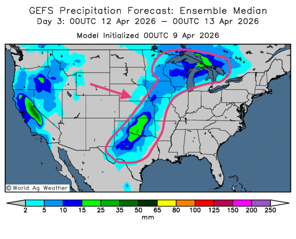 - De façon générale, les prévisions météorologiques pour les États-Unis semblent adéquates à court terme. L’analyse des cartes GFS (World Ag Weather), illustrées jusqu’au 3e jour, montre des possibilités de pluie, plus ou moins abondante, sur le centre et le sud des Grandes Plaines ainsi que dans la région des Grands Lacs. Toutefois, un temps sec pourrait persister dans le nord des Plaines et le Sud-Est des États-Unis. Comme le montre cette carte du 3e jour, des précipitations pourraient s’étendre de la région des Grands Lacs jusqu’au Sud-Ouest, vers le Texas.