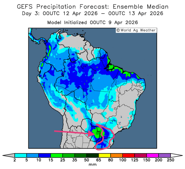 - Globalement, les conditions météorologiques restent favorables à court terme dans la plupart des régions du Brésil. L’analyse des cartes GFS (World Ag Weather), illustrées jusqu’au 3e jour, montre une alternance possible de pluie et d’ensoleillement dans la plupart des zones de production. Comme l’illustre cette carte du 3e jour, des averses pourraient également toucher les secteurs asséchés du Sud-Est, englobant une partie du Mato Grosso do Sul, du Paraná, du Santa Catarina et du Rio Grande do Sul.
